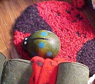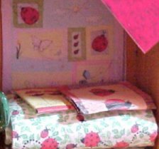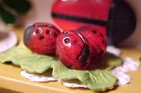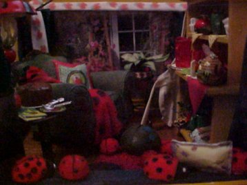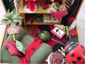 The Ladybug Lady scene began when I found a ladybug rug at a miniature show in Lubbock, Texas. It was made by Ruth Branch, a friend of Sadie Ludecke, who has made the wonderful braided rugs in my collections.