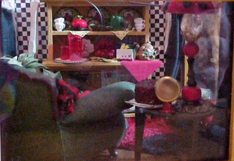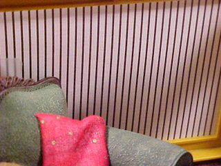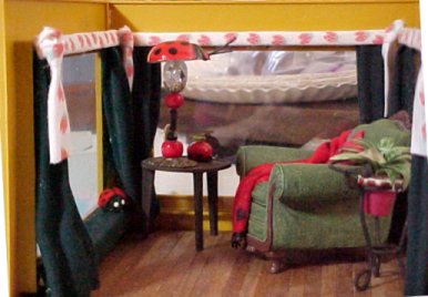The window seat was a strip of fabric-covered balsa that wedged nicely into the groove of the picture frame. For some reason, the cushion looks blue here, but is actually the same dark green as the curtains. Good grief, there goes another ladybug, trying to crawl underneath it!
