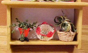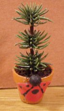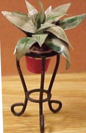 Although you can't see them here, the pot's paper rim has ladybugs painted around it. The plant is made of painted paper. The black plant stand originally was inexpensive brass. I had to cut off that odd upper rim; it took up too much space in my very small setting.