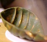 Another painted leaf finding makes a bowl. Rubbing away some of the green paint allows a bit of the gold to show through; a nice effect.