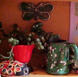 The ladybug platter standing against the back of the hutch was made with a flat oval of red plastic and black tape. The leaf dish was from dollar store earrings; also painted green.