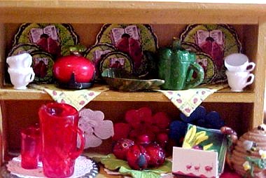 Here's a clearer picture of the big leaf dish with the chocolate-marzipan goodies. I made the napkin holder and napkins. The shelf liners on the upper shelf are made from paper. I discovered that fabric from paper looks more realistic if a tiny edge is turned under; gives it more of a dimensional rounded hem look.