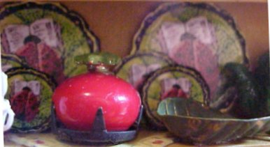 "Your hutch reminds me of my china cabinet." I commented. "I also have several colorful items that have been given me by family and friends. Love those plates with the reading ladybugs! How appropriate for you, in your little reading room." I looked more closely. "May I ask what that is?" I asked, pointing toward some colorful objects in a green leaf dish.