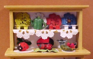 The teapot was a show purchase at the Lubbock Miniature Show a few years ago, intended for my Honey Shop, but I needed another teapot for this setting, and there is a pale ladybug on the lid, so I used it.