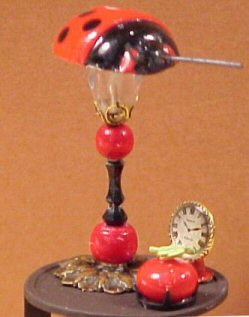 I made the rather over-the-top lamp from beads and findings; its shade was one of several inexpensive metal pins, including a honeybee and dragonflies, that I used to wear on my sun hats. By the way, that longish black bead is a dogbone bead, very difficult to find, at least in my area. If you find any, get them; they are always good for making lamps and useful for longer stems or stands for various accessories. The clock has a printed face which was coated with sealer; it sits on a red eyelet. I didn't think about the fact that the plain gold back of the clock would be facing outward when I glued the table in place. If I were to do it again, I would probably angle it more.