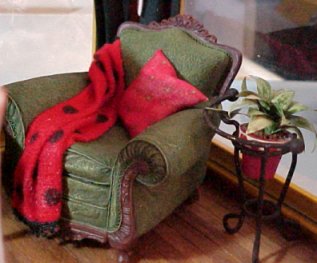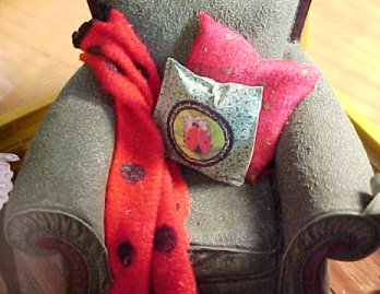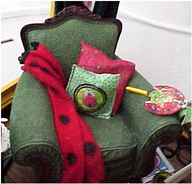 This Take-A-Seat Chair by Raine is the Veridian. Slightly smaller than twelfth scale, it was perfect for this little setting. Its well-used green blends perfectly with the red, green, gold and black color scheme. I had originally planned to add a ladybug applique to that pillow; don't recall now why I didn't.