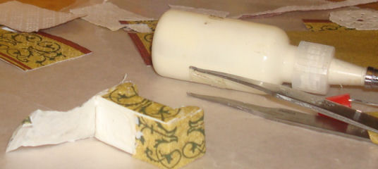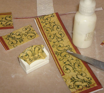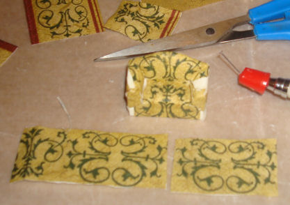 I used regular Tacky glue in a metal-tipped dispenser and put glue on both the furniture section and the paper piece, which made it even more malleable. There are no patterns as such; I just used the techniques my mother used when she made slipcovers. I cut sections and pressed them in place with my finger tips to get an idea of the shape, then cut individual pieces to glue in place. I started with the chair front and seat, making sure the designs were as centered as possible. I covered the round ends of the chair arms first and then glued the arm pieces.
