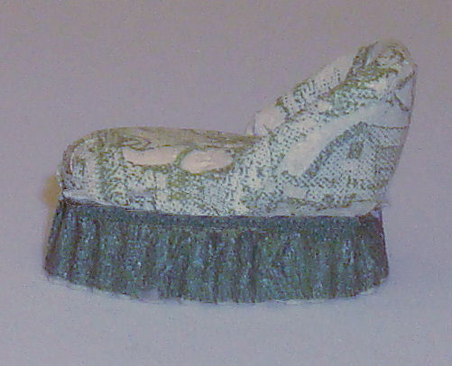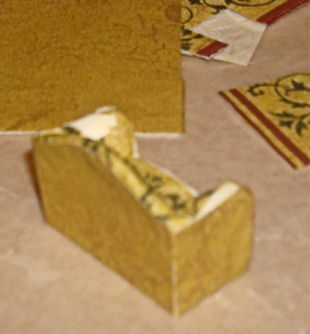 Here the ends and base are covered. I forgot to take pictures of the rest of the upholstering, but basically I laid a strip from front to back to cover my seams. I covered my cardboard back and glued it in place, and made a seat cushion.