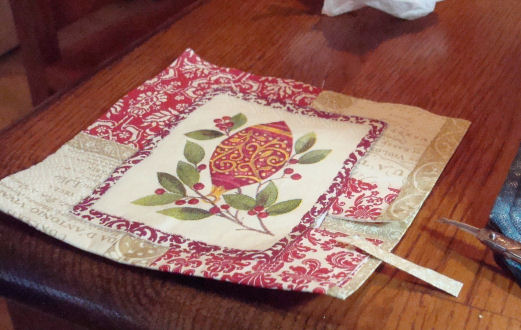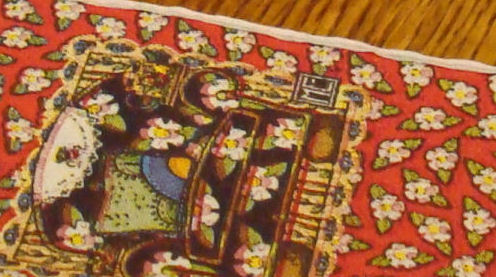 I cut a strip from this Christmas napkin (like the one in the middle of the left side) to form the table runner for the table in my NAME QC Hutch setting.