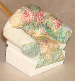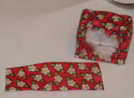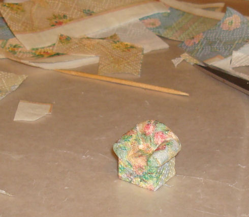 I thought I would make pillows, but neither of the solid colors worked. I used the eraser to cup the section, then glued it over a tiny cotton ball, but didn't like the look so left my sofa pillow-less.