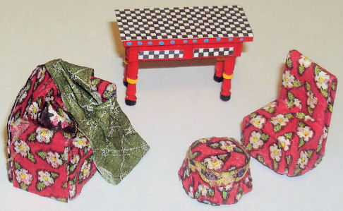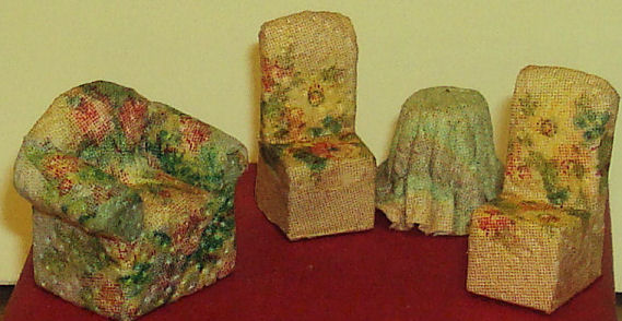 This picture shows the sofa, chair and ottoman. Oh shoot; it's all too big, too tall for my tomato scrubby! I didn't realize that leaving the second ply would add that much extra thickness to my paper, but it sure did when you consider how many layers were folded over, and over. And when I started upholstering the BPF I didn't think about the fact that those chair seats might be taller than the seat of a sofa.