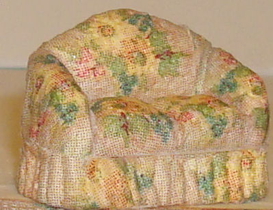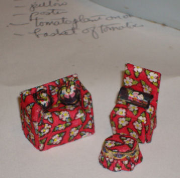 Some time ago I decided to use a Mary Engelbreit paper tissue for a sofa. Its bright colors and cheery flowers were perfect for a tomato scrubby that I wanted to use for a canning scene, and I loved that doily on the back of the chair.