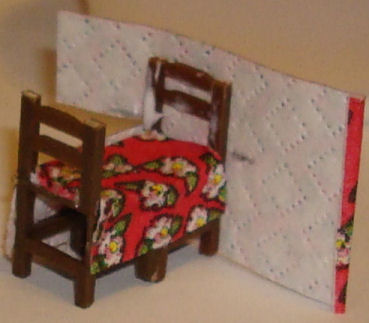 However, this white featherbed in my Sunday House is made from several layers of pristine white Kleenex. The long pillow case is also tissue, although the edging is cotton lace. The quilt and pillow are made from printed fabric.