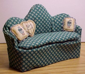 I made this Christmas sofa following general directions given by Susan Sirkis in the September through December, 1984, issues of Nutshell News (now Dollhouse Miniatures). She put together a Greenleaf McKinley wallhanger house and furnished it with similar Greenleaf tab-and-slot furniture.