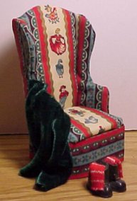 This chair comes from the same set. I think the back is too tall, but since this is one of Santa's chairs, I suppose it gives it a more throne-like look. If I were to do this now, I would cut the back down some. (And I would use some larger boots for Santa!)