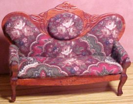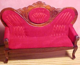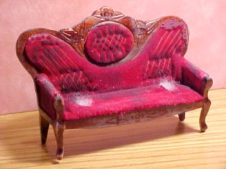 Most of us who have been doing minis for any length of time have at least one or more of these ubiquitous red Victorian sofas. I have a weakness for anything that I can buy at incredible prices, and when I found some at Ross for $1.99 each I bought several. Below are two of the projects I did with these sofas.