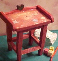 Here I have removed the blocks and the piece of fabric. (Those little blocks became toys for the piglets in the Pigness Protection Program setting.) I used the same process as above to revamp and repaint this piece, which became a side table in a larger setting, Raul's Gift in the Southwest pages.