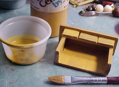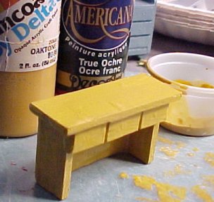 Since this is a southwestern scene, and the box in which they will appear is dark, I decided on brighter colors. Here's the first coat on Miss Delly's kitchen table.