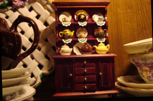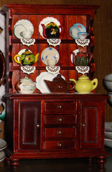 This little hutch with some of the mini teapots from my collection now resides next to the Tetley Teapot in our china cabinet.