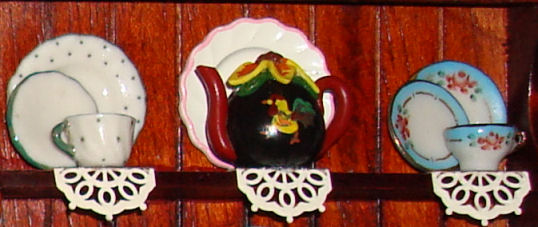 The doilies on the shelves were cut from a variety of laser trims that decorated a gorgeous Mother's Day card from my daughter and her family. I have carefully saved those beautiful lacy pieces to use very judiciously. I used a few in Miss Minnie's Hattery Flattery Hatshop.